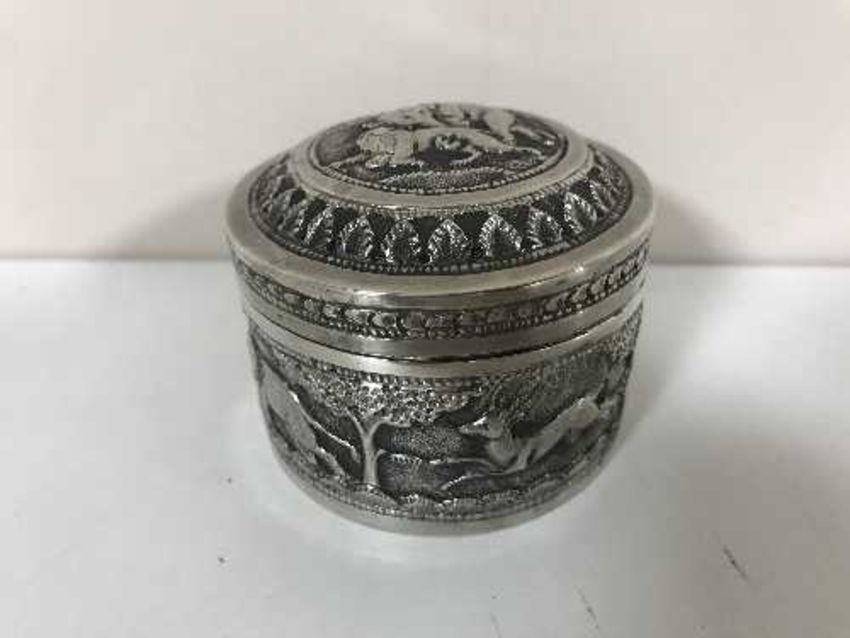An Indian silver dressing table pot, embossed with scenes of tigers pursuing elephants and deer, stamped with maker's initials 'D C' and '90', width 6.5cm