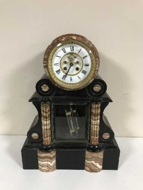A Victorian two tone French marble mantle clock with open escapement and mercury pendulum