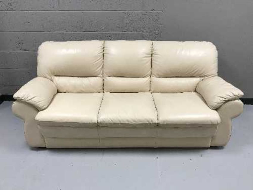 A cream leather three seater settee