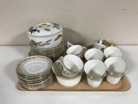 A tray of Royal Chelsea tea service, Royal Worcester oven dish, Royal Albert sugar basin, etc