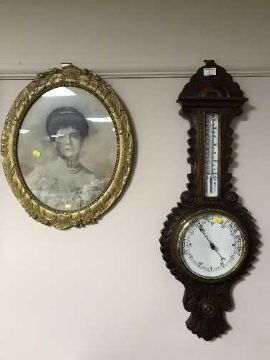 A heavily carved oak cased barometer and an antiquarian gilt framed portrait