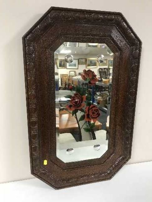 An early 20th century oak framed bevel edged mirror
