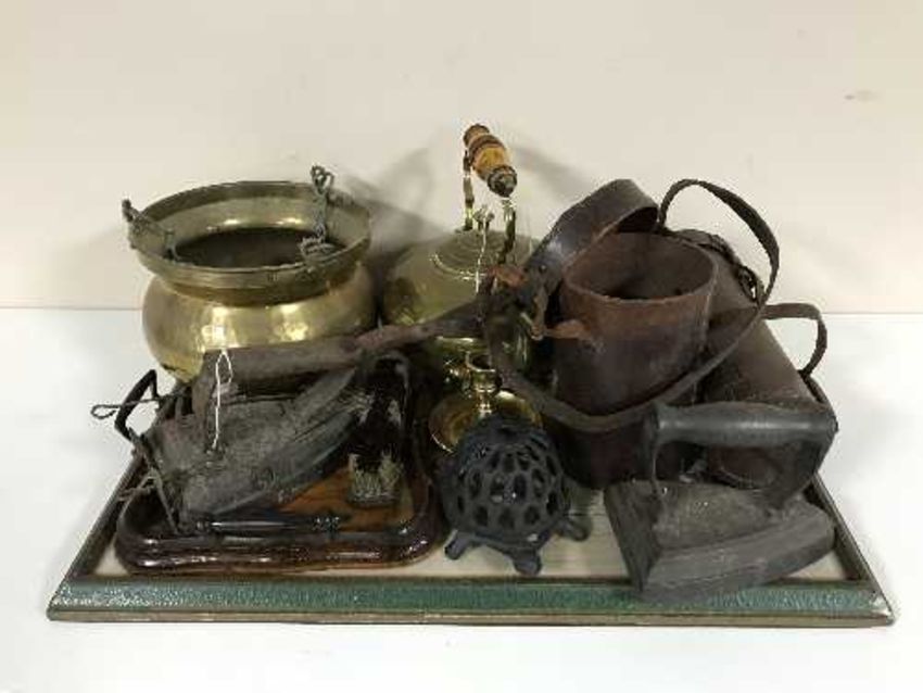 A tray of brass hanging planter and kettle, hearth brush, scoop, flat irons, leather flask holder etc