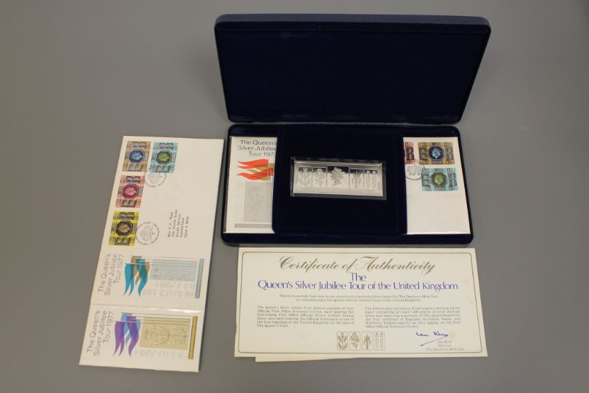 The Queen's silver Jubillee Tour of the United Kingdom, a boxed silver proof ingot and first day cover set, with certificate, by The Danbury Mint