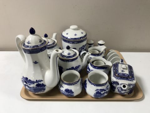 A tray containing a quantity of unboxed Ringtons blue and white Willow pattern china including coffee and teapots, milk jugs, salt and pepper, ginger jars etc