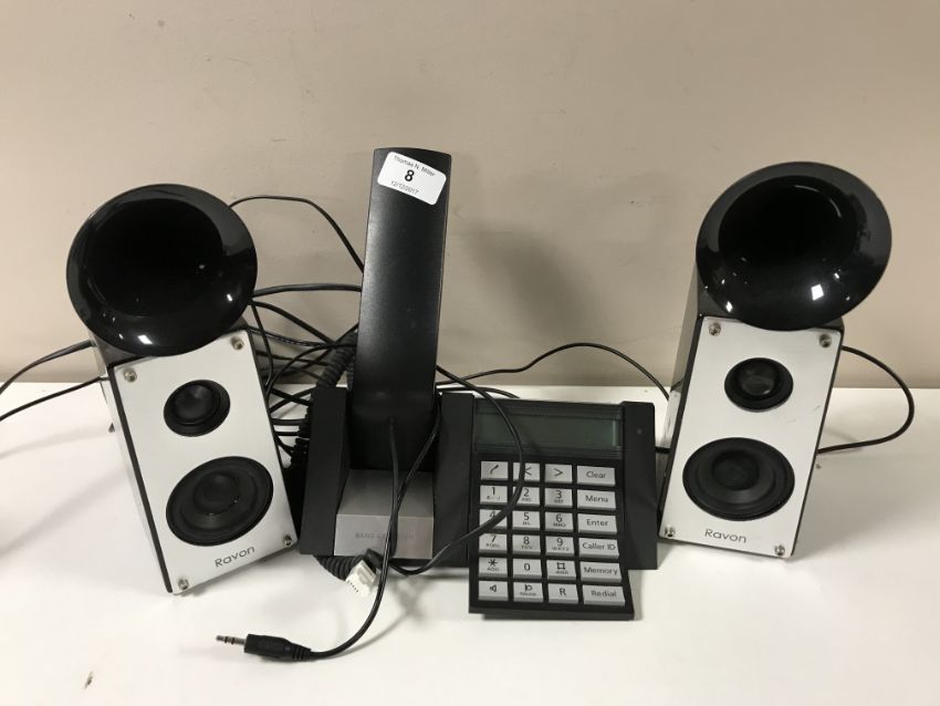 A Bang and Olufsen BeoCom 2500 telephone set together with a pair of Ravon multimedia speakers