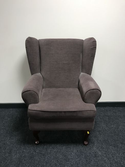 A wing back armchair in a brown fabric
