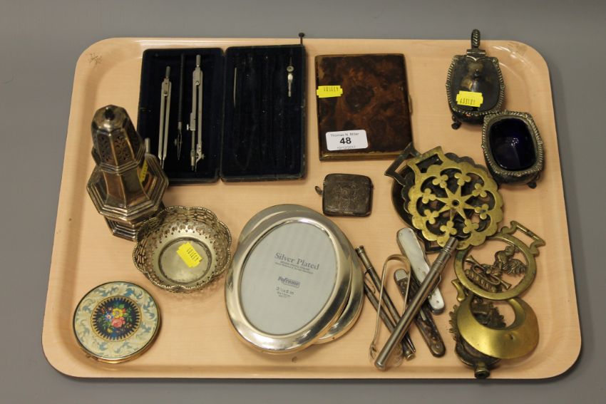 A tray containing plated wares, horse brasses, silver vesta, writing utencils, penknives etc (Q)