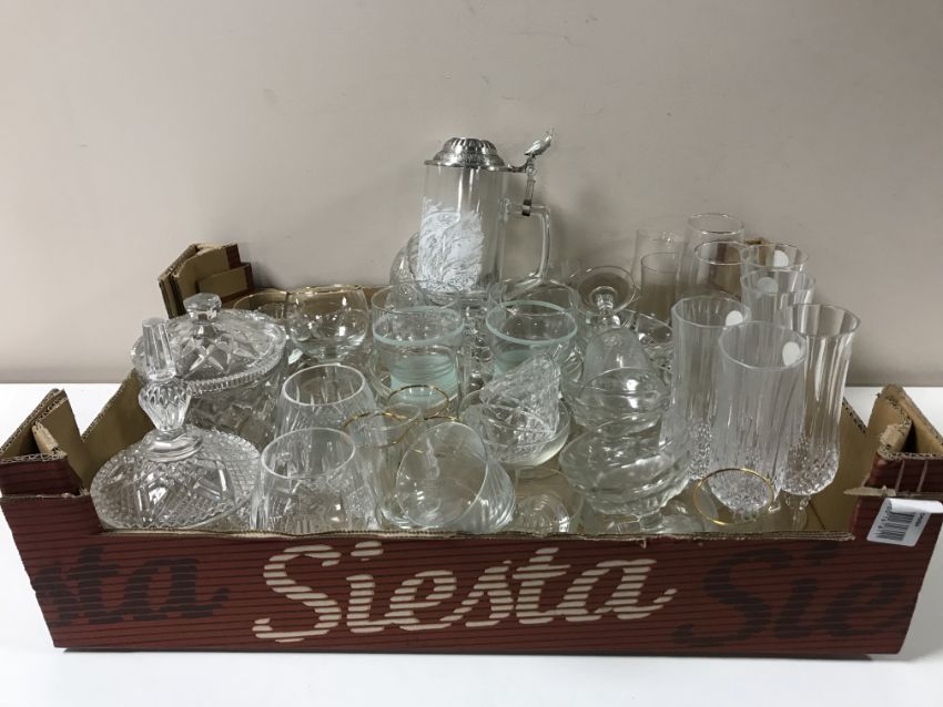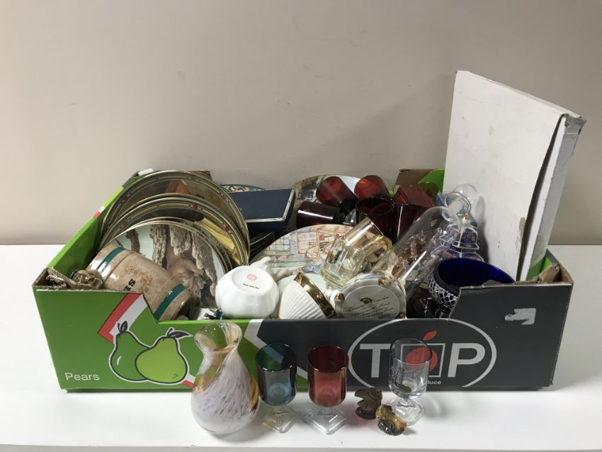 Two boxes containing a large quantity of glassware, collector's plates, sherry barrel, Caithness vase etc