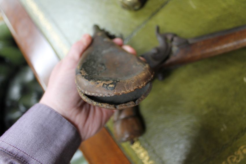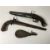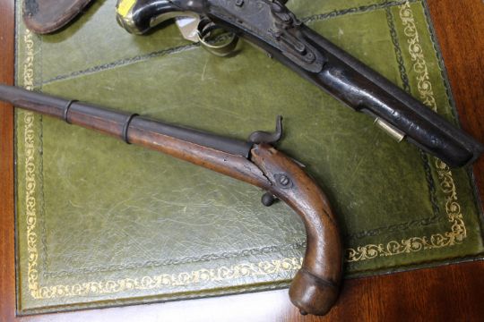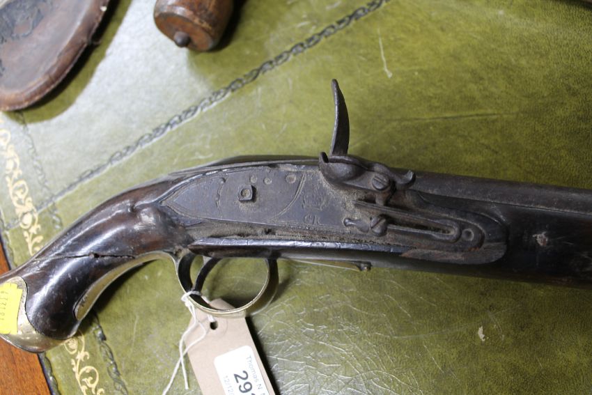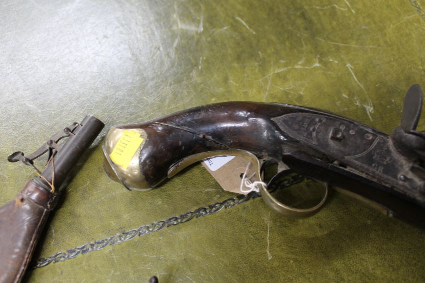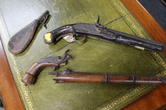 A George III Tower flintlock pistol, together with a 19th century percussion cap boot pistol and a leather shot flask (3 a/f) CONDITION REPORT: Poor condition throughout. Numerous splits to walnut stocks on both pistols, as well as losses. Metalwork pitted. George III pistol lacking the jaw and flint. No ramrod. The boot pistol is in two pieces, the percussion hammer is the only thing holding the grip and barrel together. Shot flask split. See images.