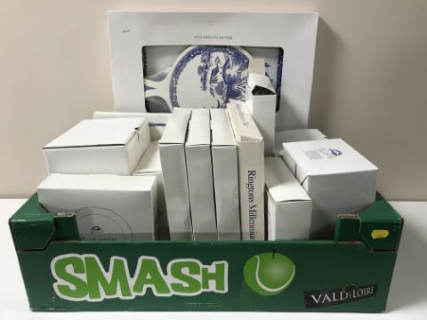 A box containing a quantity of boxed Ringtons Willow pattern china including butter dishes, wall plates, storage jars, place mats etc