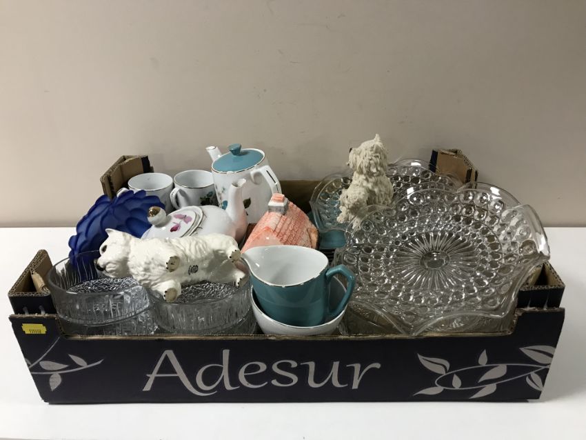 A box containing assorted china and glassware including Beswick dog, coffee service etc, together with two vintage Antler luggage cases