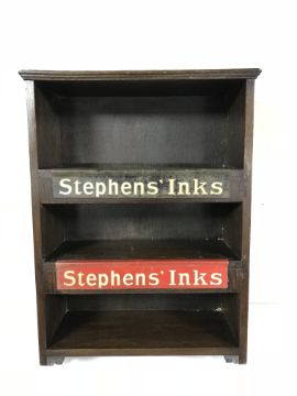 An early 20th century oak wall cabinet bearing two Stephen's Ink advertisements
