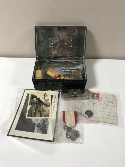 A collection of medals, silver brooch, military photograph, sweet heart brooches, Airborne snuff box, WW1 postcard etc.