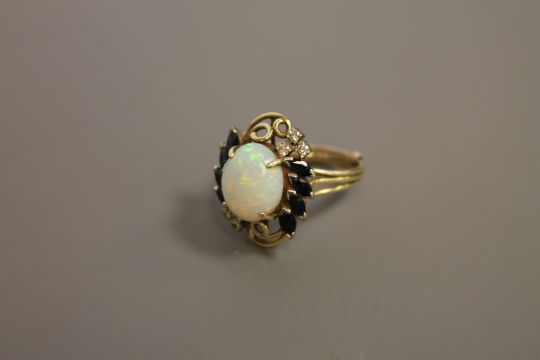 A sapphire and diamond ring set with a large opal