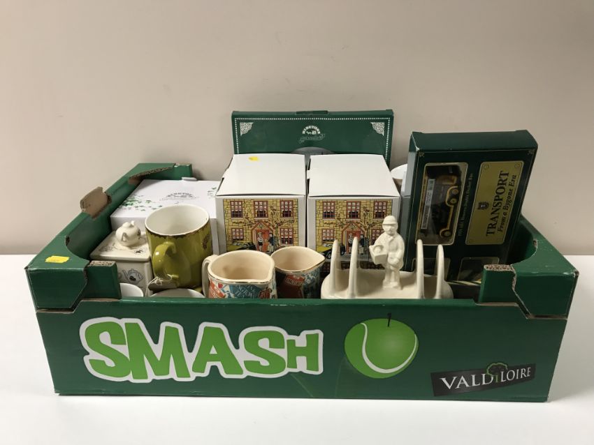 A box containing a quantity of boxed and unboxed Ringtons china including caddies, jugs, teacups, die cast vehicles etc