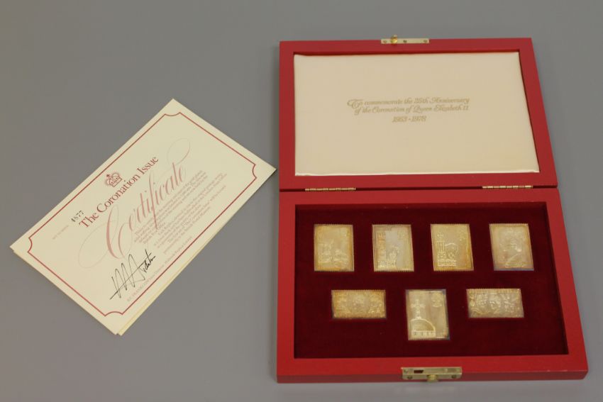 The 25th Anniversary of the Coronation of Queen Elizabeth II, a set of 7 sterling silver proof stamps, a limited edition of 5000, boxed with certificate