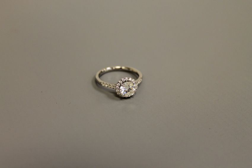 An 18ct white gold diamond ring in halo setting, ring size N/O