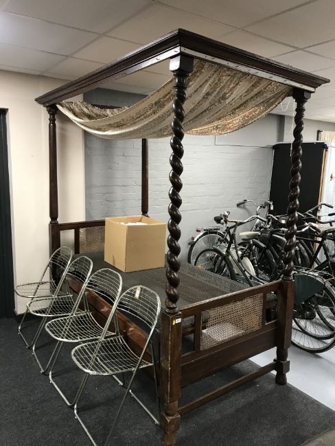 A Victorian barley twist column 3' four poster bed with box spring and curtains