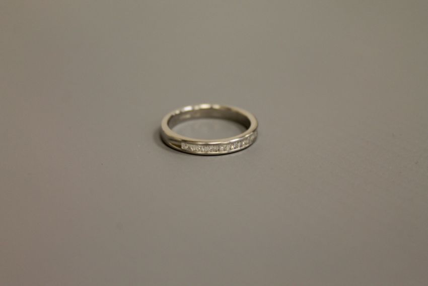 A platinum princess cut diamond half eternity ring, approximately 0.7ct, size M.