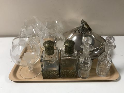 A tray of 20th century plated entree dish, two decanters, brandy glasses etc