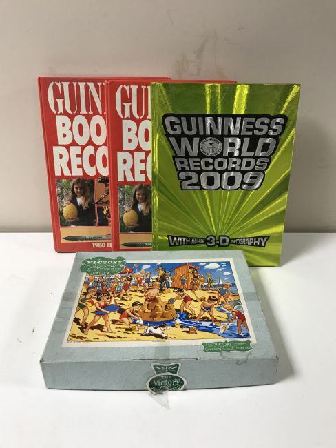 Two boxes of a quantity of Guinness Book of Records, coffee table volumes, jigsaws etc