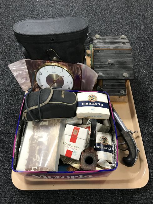 A set of cased binoculars, a Betima 8 day mantel clock, postcards, cigarette cards, etc