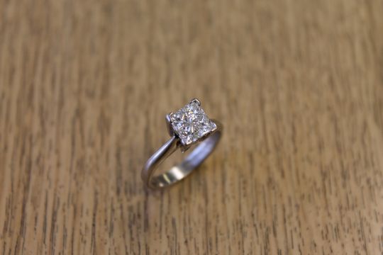 The ring is in good condition. It is stamped '900' for platinum, as well as the maker's mark 'JB'. The approximate qualities of the diamonds are as follows; Colour - H/I. Clarity - ranging from VS1/VVS2. Ring size N. See additional images.