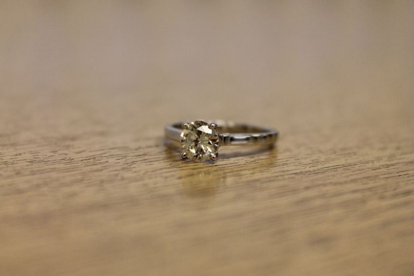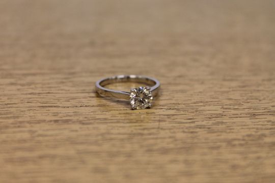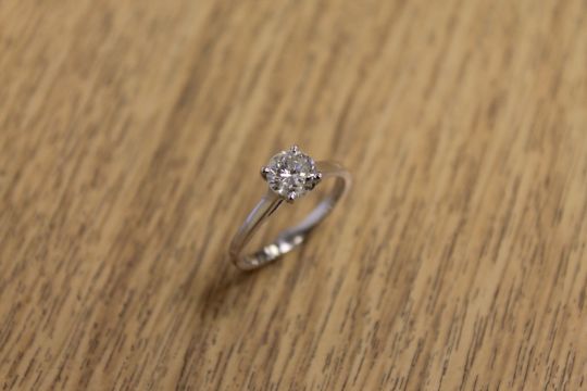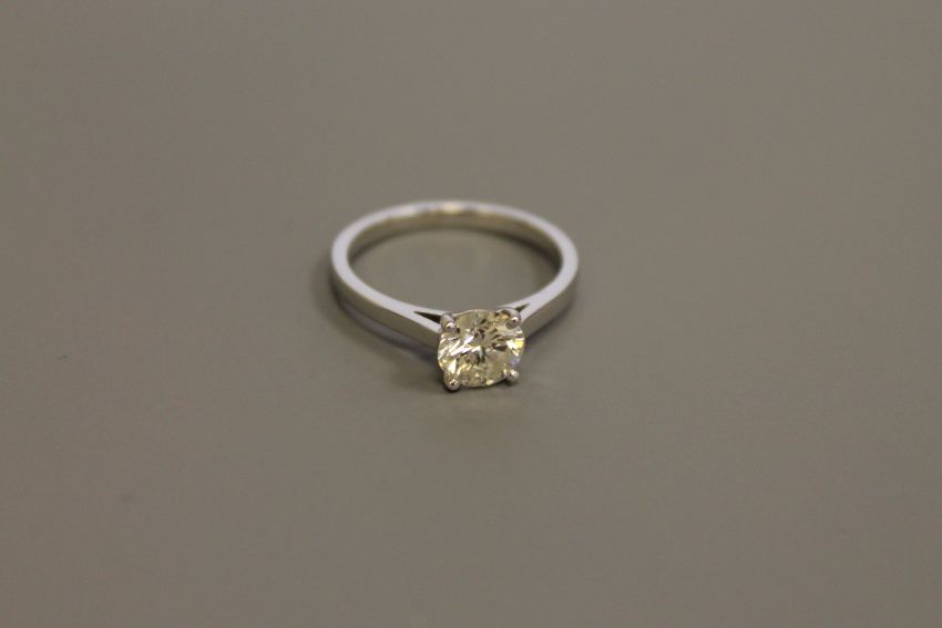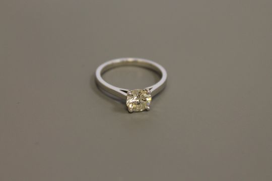 The ring is stamped '750' for 18ct gold. The approximate qualities of the diamond are as follows; Size - 1.25ct, Colour - H/I, Clarity - VS2/SI1. The diamond has a small fissure or crack approximately 1mm in length near to one of the claw mounts, there is also a very tiny chip to the girdle at the same point. See additional images.