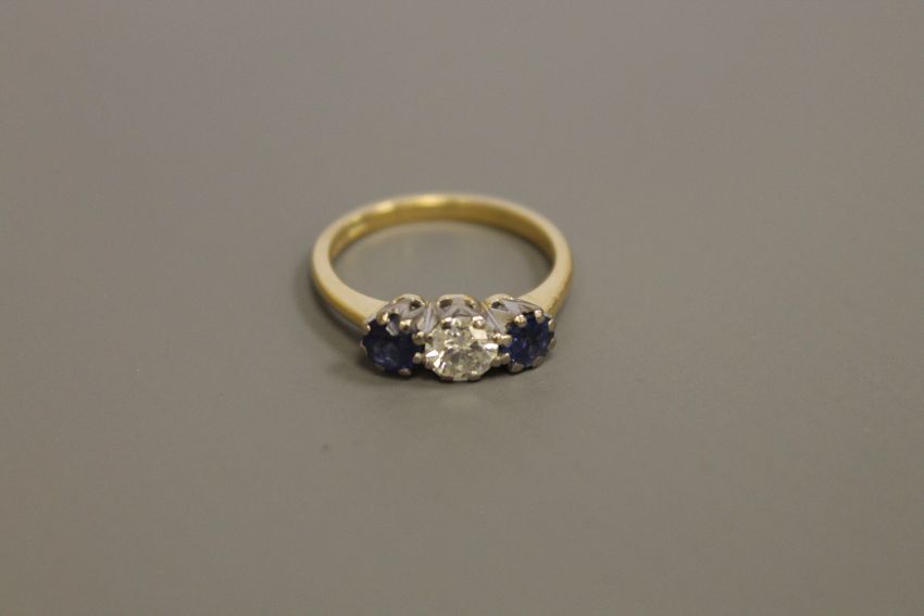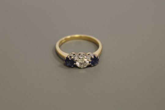 An 18ct gold three stone sapphire and diamond ring, the central stone weighing approximately 0.5 carat, size M