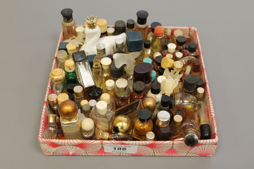 A tray containing a large collection of perfume miniatures