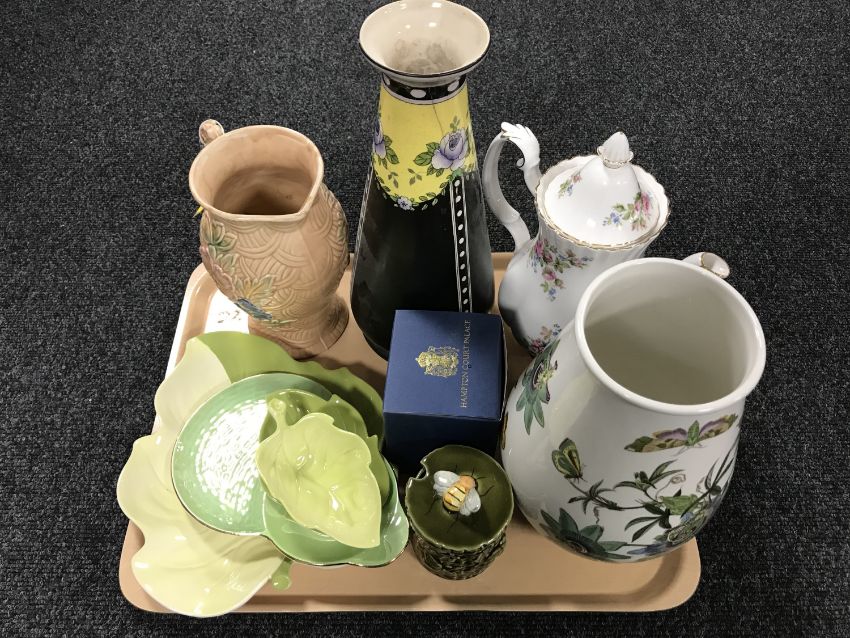 A tray of Port Merion vase, Carlton ware leaf dishes, Arthur Wood jug, Royal Albert teapot etc