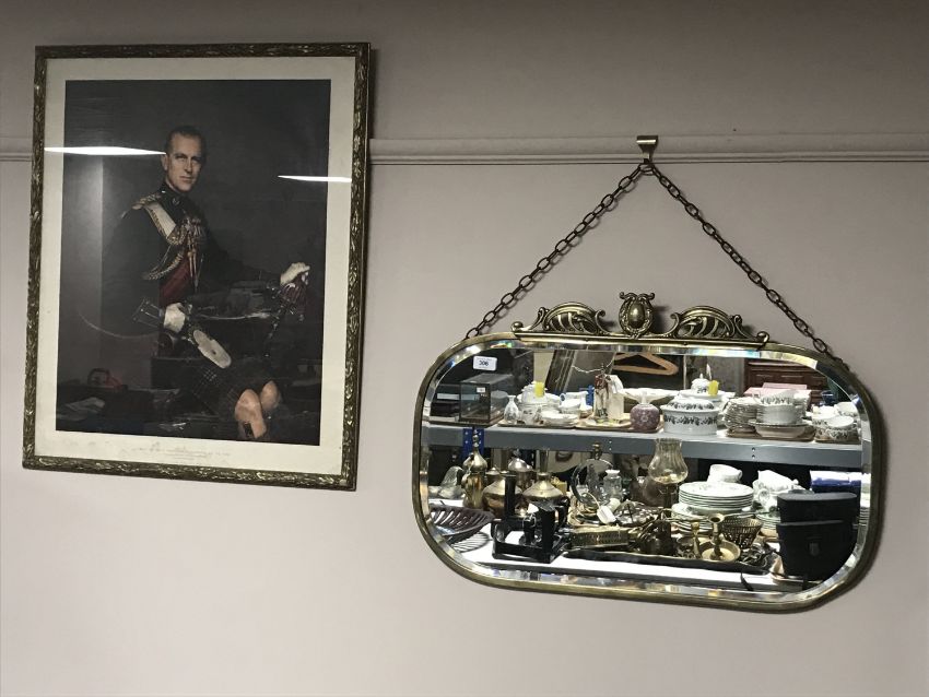A brass framed Art Nouveau mirror and a gilt framed print HRH Philip The Duke of Edinburgh by Leonard Boden