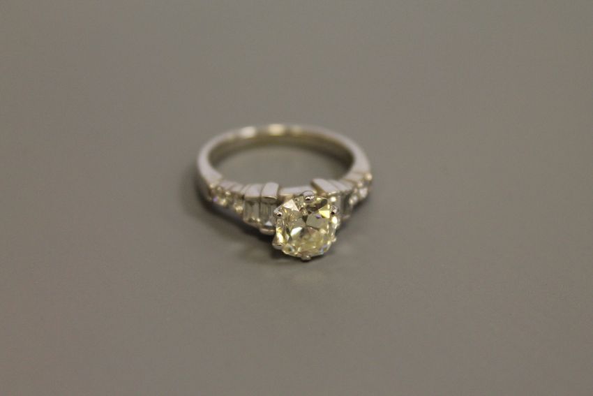 An 18ct gold solitaire diamond ring, the principal stone weighing an estimated 1.8 carat, with diamond set shoulders, size M/N