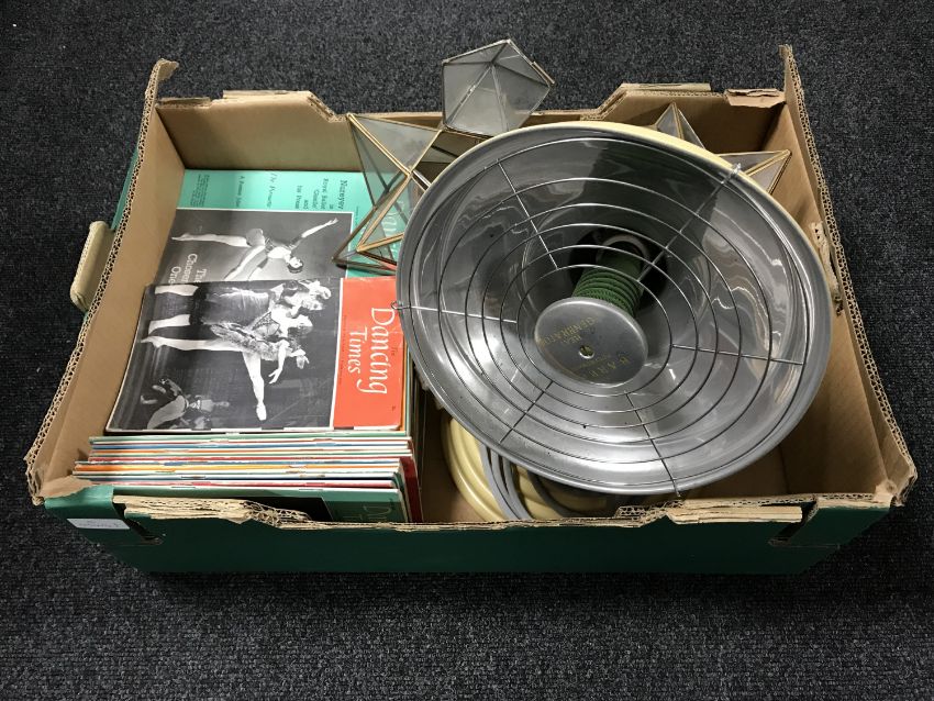 A box of 1950's dancing times magazines, a barber health lamp, two metal glass star shades