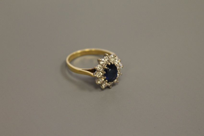 The ring is in good condition. It weighs 5.1g and is size P/Q. The ring is stamped 750 for 18ct gold. The date letter is rubbed but from the style of the hallmark this would appear to be a late 20th century ring. The sapphire has a good, deep-blue colour. It has a very small chip to one of the facets when viewed under magnification but is otherwise very good. The total diamond weight is estimated at 0.9 carat. The diamonds are approximately G/H in colour and VS1/VS2 in clarity.
