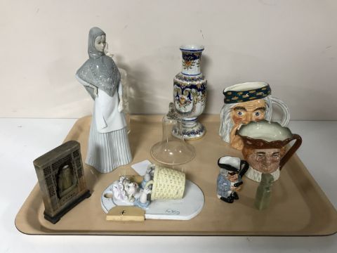A tray of collectables including Chinese soapstone seal, Chinese carved deity, Spanish figure, glass chemist's bottle, three character jugs, German porcelain child plaque etc.