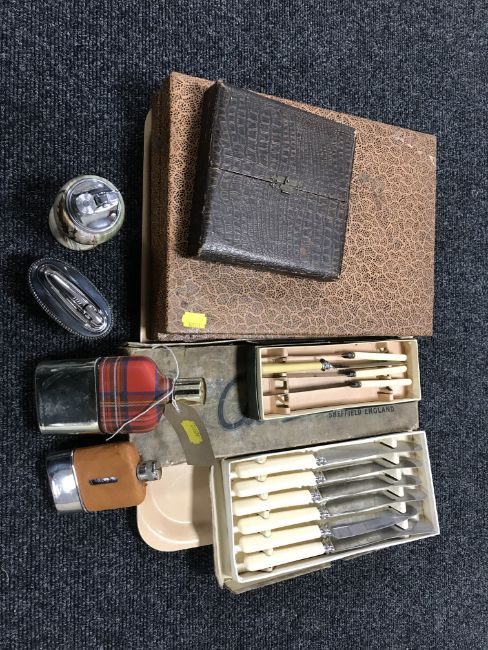 A box of plated ware, cutlery, hip glass, table lighter etc
