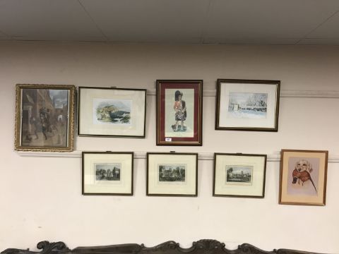 A group of eight antique and later colour prints depicting a labrador, military subject, street scenes etc