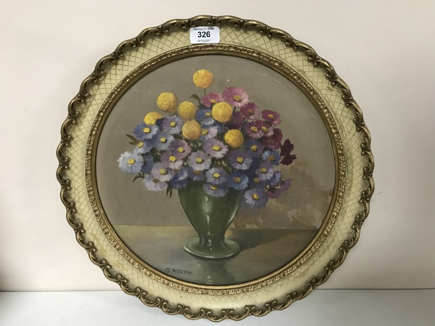 An oil on board - flowers in a vase by G. Austin in an ornate cream frame