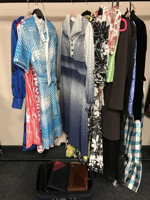 A small quantity of vintage lady's clothing and a suitcase of hand bags