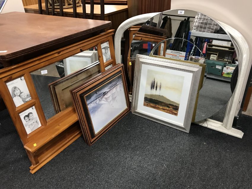 An un-framed mirror, cream framed over mantel mirror, A pine mirrored over mantel/photo frame, two Richard Barrett prints and two pine framed prints of ships