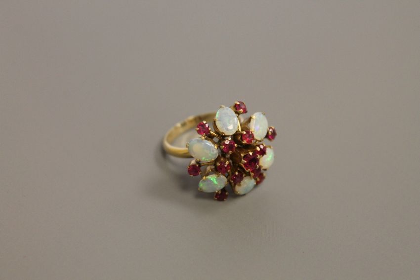 An 18ct gold opal and ruby cluster ring, size O/P