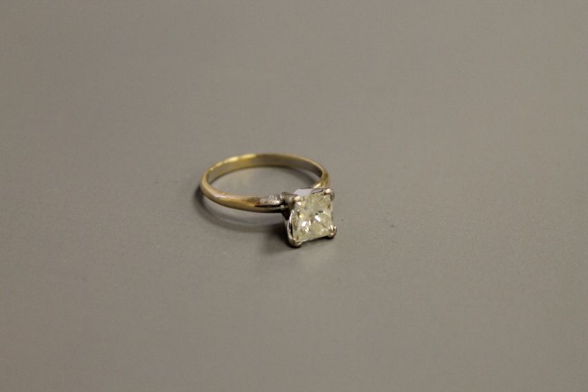A 14ct gold solitaire diamond ring, the princess-cut stone weighing 1.45 carat approximately, in a claw setting, finger size N