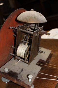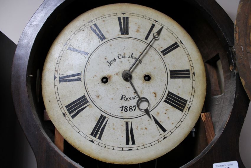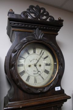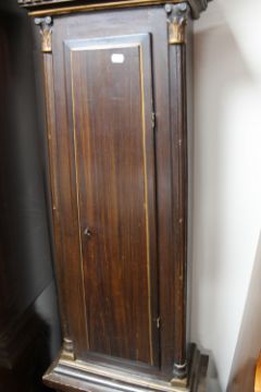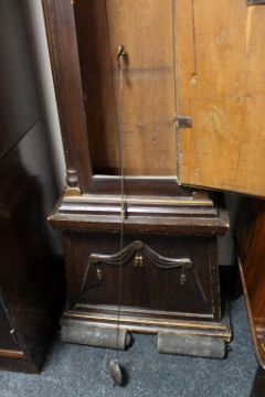 Base uneven and clock leaning slightly to the left. Case with surface wear i.e. scuffs and scratches throughout. Dial discoloured and with rust spots. Hood door hinge rather wobbly. Hood with signs of old worm to top. Movement dirty. Pendulum and weights present. Height 213cm. Please see additional images.