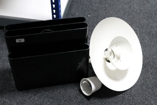 A contemporary Italian Kartell black plastic magazine rack together with a circular metal light fitting