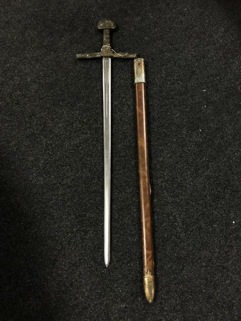 A longsword in scabbard with brass handle and pommel