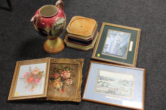 A Victorian transfer printed vase on stand together with two gilt framed oils - Still life, Lowry print etc