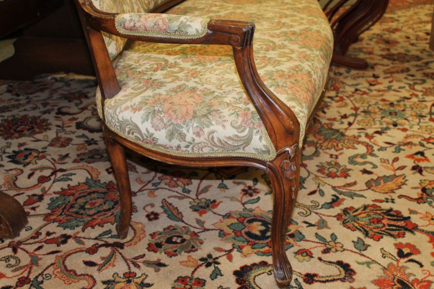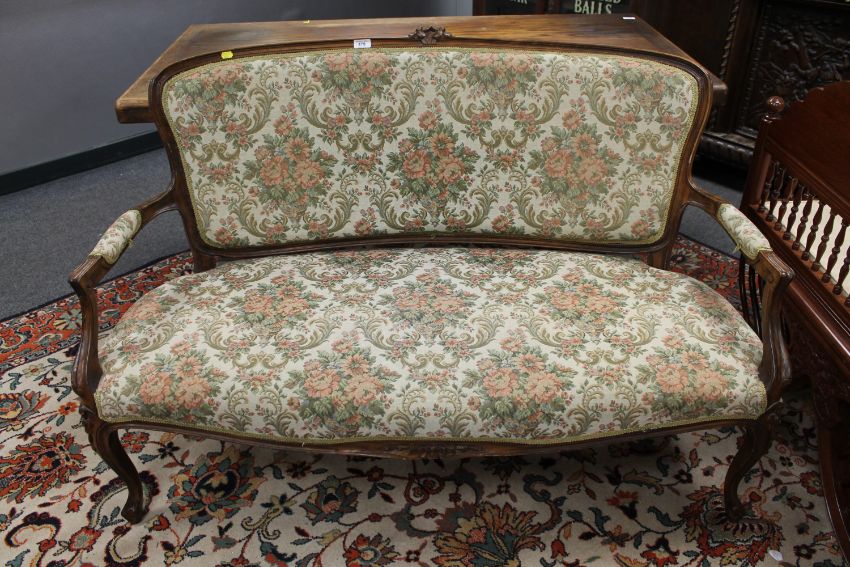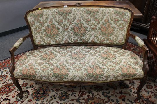 This measures 137cm wide by 73cm deep by 91cm high. This is generally in good order. Some fraying to the upholstery. Frame with slight wobble. See images.