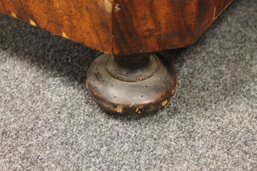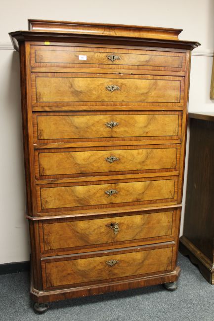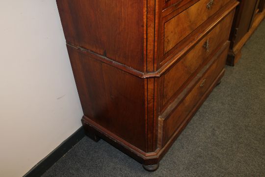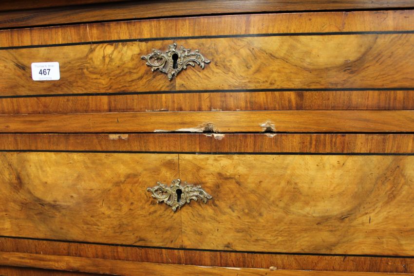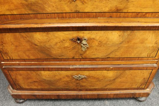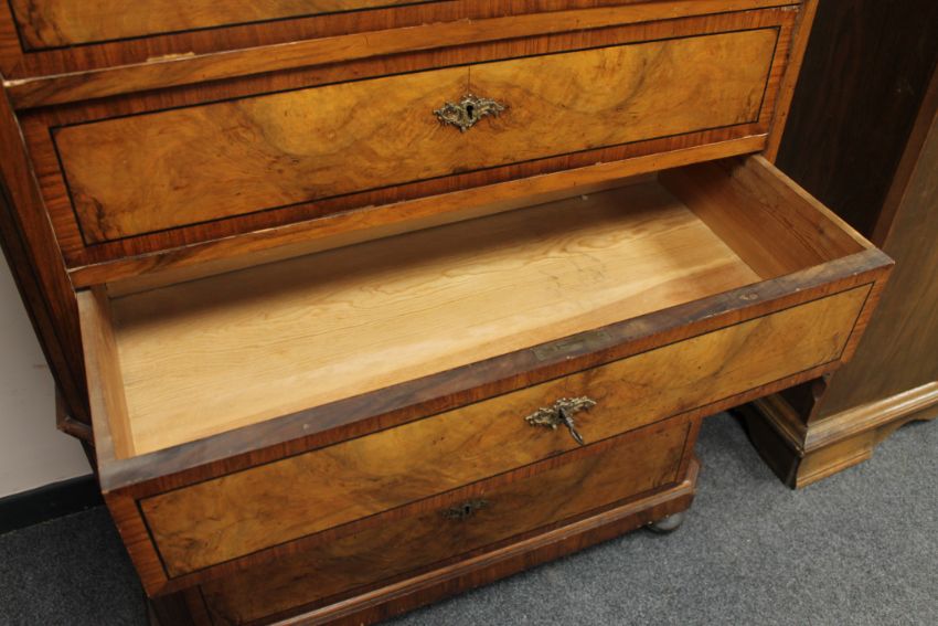 Numerous small veneer losses to drawer fronts. Losses to moulded frieze on either side. One escutcheon loose. Drawers stiff. 2nd draw appears to be jammed. Woodworm to feet. 166cm high, 104cm wide, 52cm deep. See additional images.